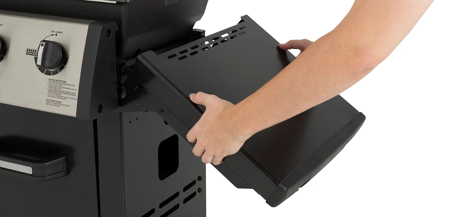 Die beiden wetterfesten Seitenablagen sind aus lackiertem Stahl gefertigt und besitzen integrierte Zubehörhaken. Zum Verstauen können beide Ablagen unkompliziert nach unten geklappt werden.